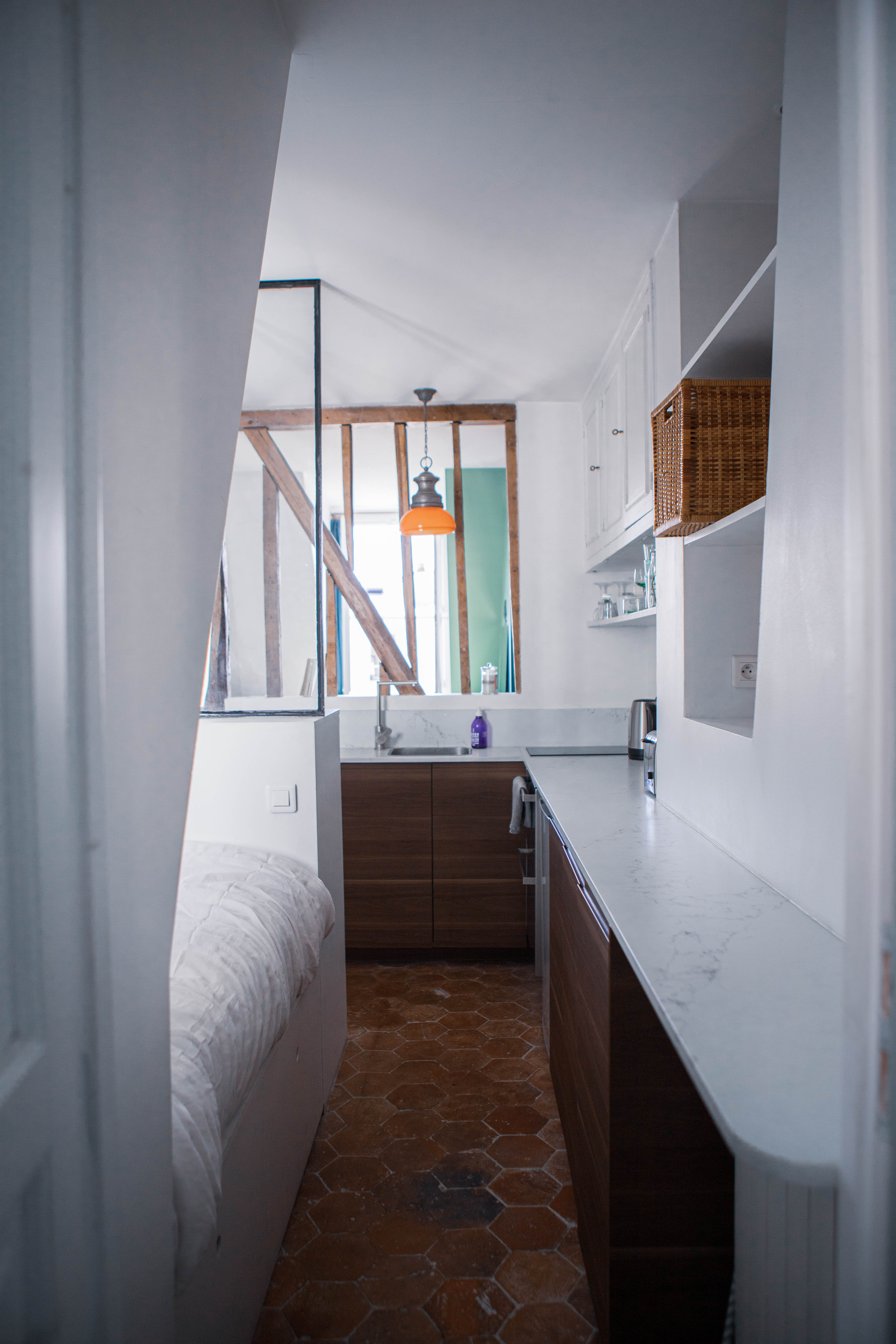 Réagencer ce petit studio sous les toits de Montmartre pour en faire un nid douillet au style vintage, avec une verrière élégante faisant écho aux poutres originelles en bois, découvertes lors de la démolition.Partenaires